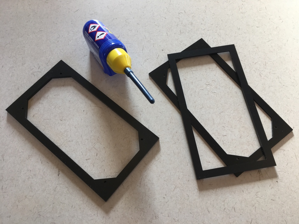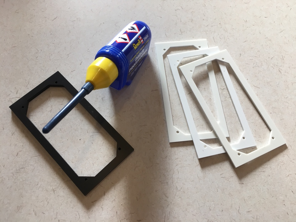 Der Platinenrahmen wird zunächst zusammengeklebt (schwarzes Polystyrol in der gewünschten Stärke hat mein Fräsdienstleister leider nicht im Programm!)…