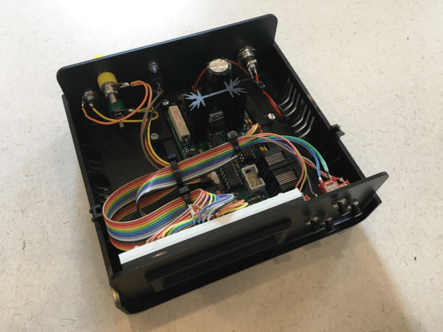 Zum Schluss habe ich den Rahmen samt Display auf die vordere Blende geklebt, alles zusammen ins Gehäuse eingesetzt und auch hier die Stecker in die entsprechenden Steckplätze der Uhrtaktgeberplatine gesteckt.
