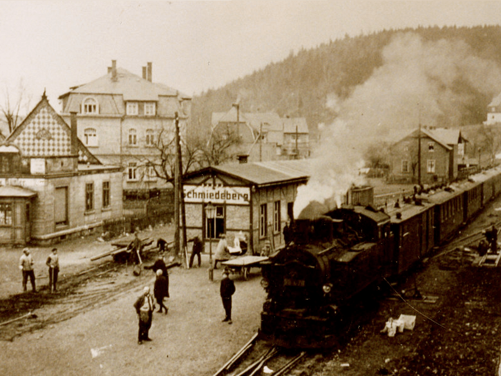 Die Wartehalle in Schmiedeberg diente bis zur Fertigstellung des Bahnhofs Kipsdorf als provisorischer Lokschuppen. Bis dahin war Schmiedeberg auch Endpunkt der Strecke.