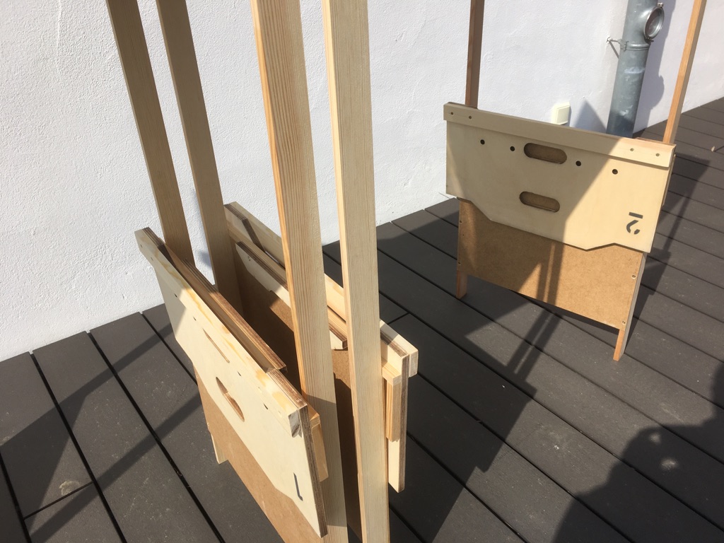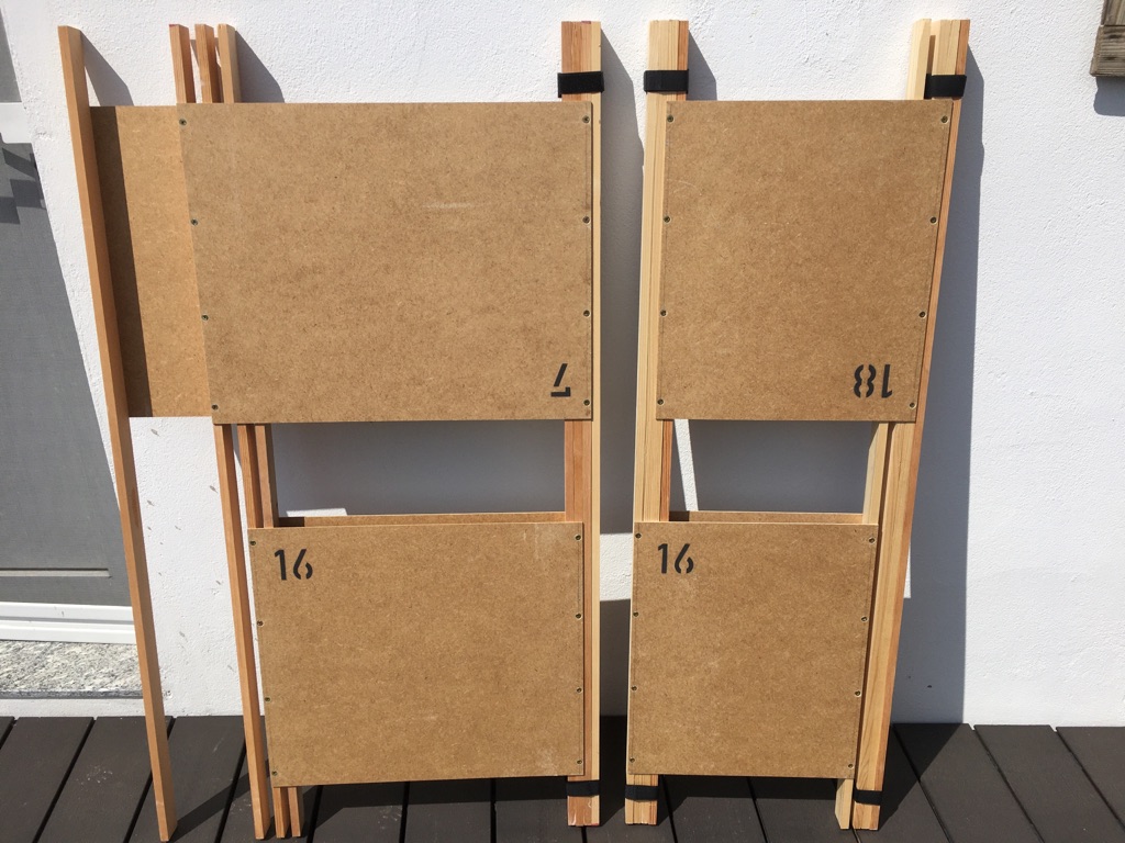 Da es (leider) 4 Module gibt, die nicht den Standardmaßen entsprechen, die eben spezielle Transportbretter und auch spezielle Beine benötigen, habe ich diese zu 2 Beinpacks zusammengefasst und die Beine entsprechend beschriftet, so dass auch hier kein aufwendiges Suchen nötig ist.